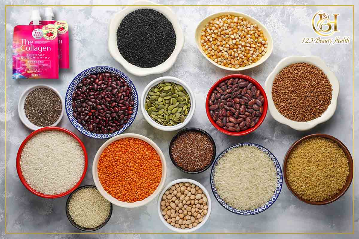 Hạt và các loại đậu như hạt chia, hạt lanh, đậu lăng và đậu nành cung cấp protein và axit amin thiết yếu cho quá trình tổng hợp collagen.
